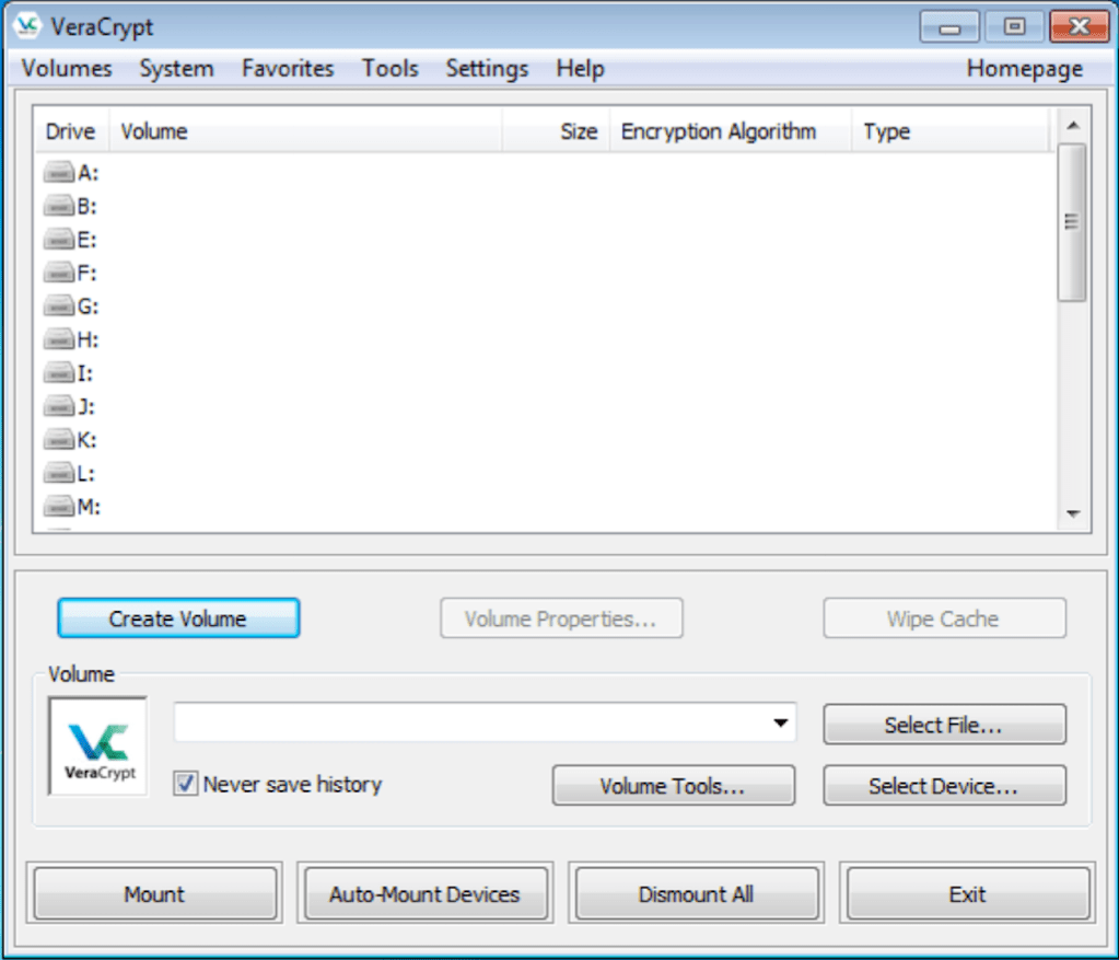 - Silahkan buka aplikasi VeraCrypt anda, disana anda lihat driver a-z yang dapat dipilih, silahkan memilih salah satunya dalam hal ini saya memilih A.