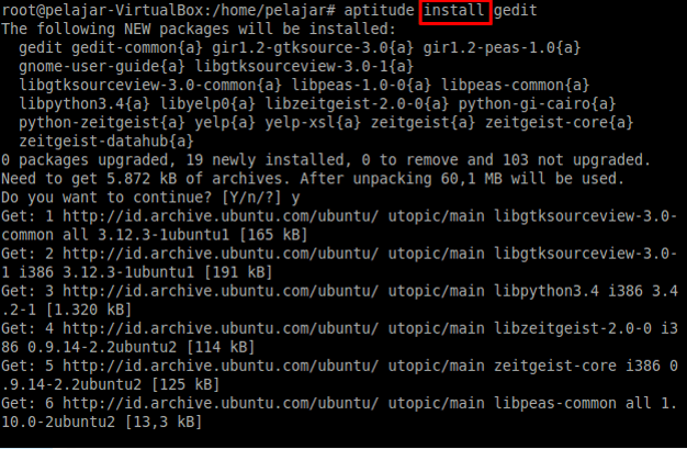 nah disini saya akan mencoba menginstall gedit menggunakan aptitude