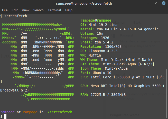 ScreenFetch adalah script bash yang berfungsi untuk menampilkan informasi mengenai Tema, informasi kerel, dsb pada linux kalian. Informasi tersebut ditampilkan lewat terminal.