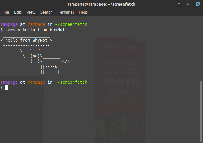 Hampir sama dengan FIGLET, namun COWSAY mempunyai bebarap script yang bisa menampilkan tulisan dan gambar, caranya jalankan perintah berikut :