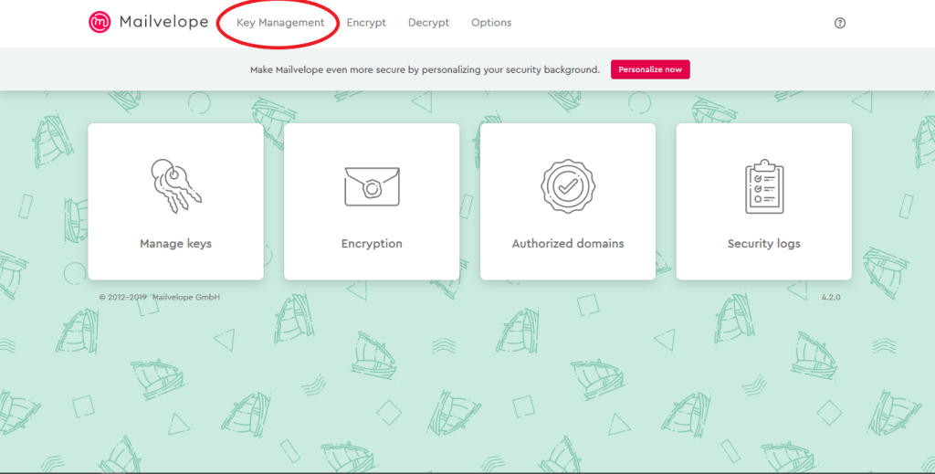 3. Klik Key Management untuk membuat PublicKey/PrivateKey Pair dan password untuk membuka, generate key, kemudian export key yang di buat tadi untuk di bagikan ke penerima.