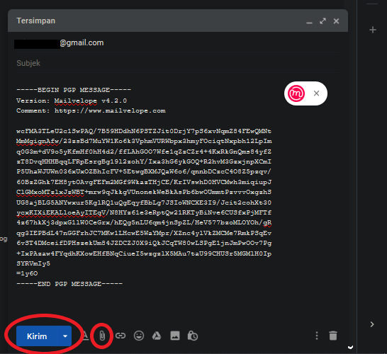 5. kemudian kirim email yang sudah terencrypt tadi dan jangan lupa bagikan Key yang untuk membuka email yang terencrypt tadi.