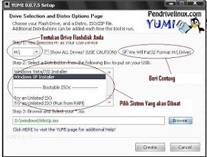 - Pertama tentukan drive flashdisk anda kemudian centang pada format drive. Lalu pada list box nya pilih OS/Distro/ISO yang ingin di buat multiboot. Kemudian klik menu browse untuk mencari file OS/Distro/ISO yang ingin dibuat. Disini saya menggunakan windows 10. Kemudian klik create.